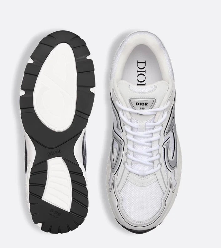 Sneakers blanches en cuir et tissu technique, confortables et stylées, parfaites pour un look casual chic.